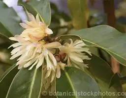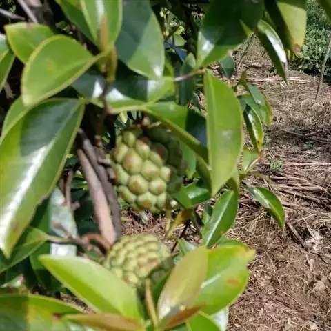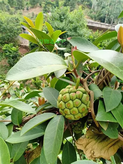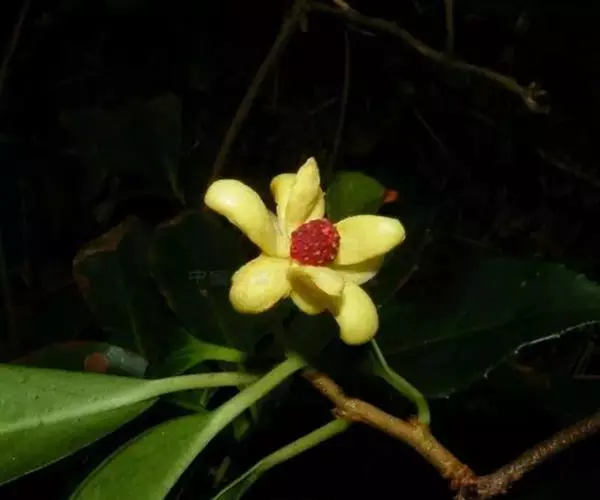 花单生于叶腋,雌雄异株;雄花:花被片白色或淡黄色,8-17片,中轮最大1片,椭圆形,长8-13毫米,宽4-10毫米;花托椭圆体形,顶端伸长圆柱状,不凸出雄蕊群外;雄蕊群球形,直径8-9毫米,具雄蕊30-70枚;雄蕊长1-2毫米,药隔与花丝连成扁四方形,药隔顶端横长圆形,药室几与雄蕊等长,花丝极短。花梗长0.7-4.5厘米;雌花:花被片与雄花相似,雌蕊群椭圆体形或球形,直径约l0毫米,具雌蕊40-60枚;子房宽卵圆形,花柱具盾状心形的柱头冠,胚珠3-5叠生于腹缝线上。花梗长3-13厘米。