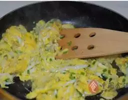 5 煸炒到韭黄变软,将炒好的鸡蛋倒入锅中一起煸炒。