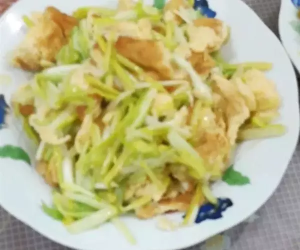 1. 将蛋打入碗内,放盐少许打散,下锅煎成薄蛋皮,切条;