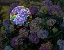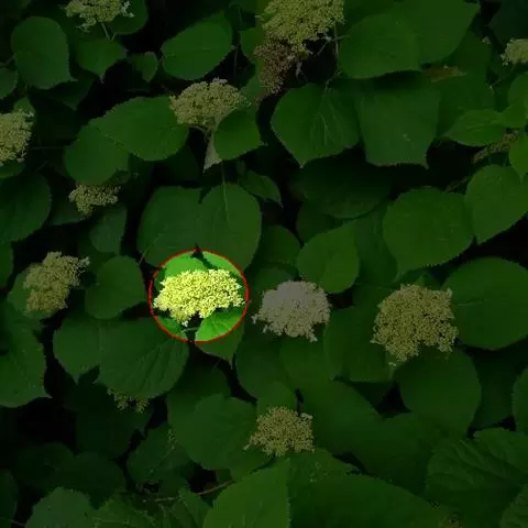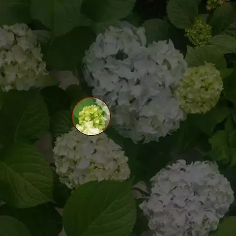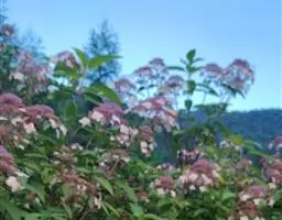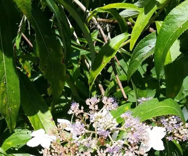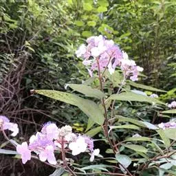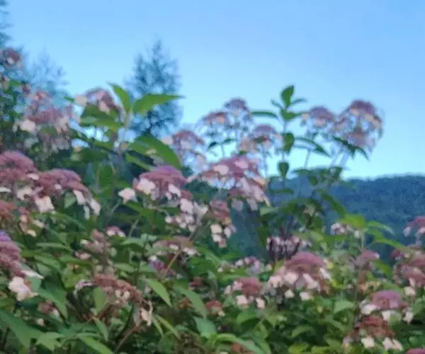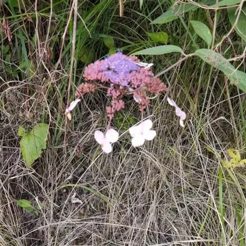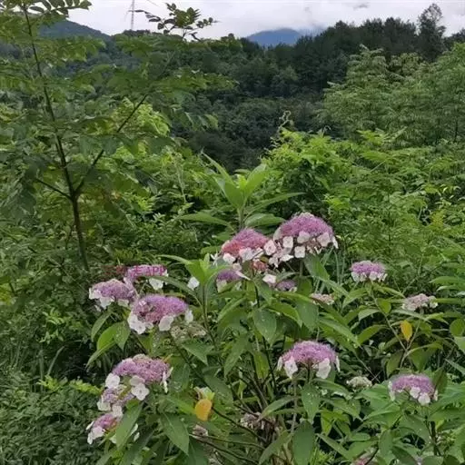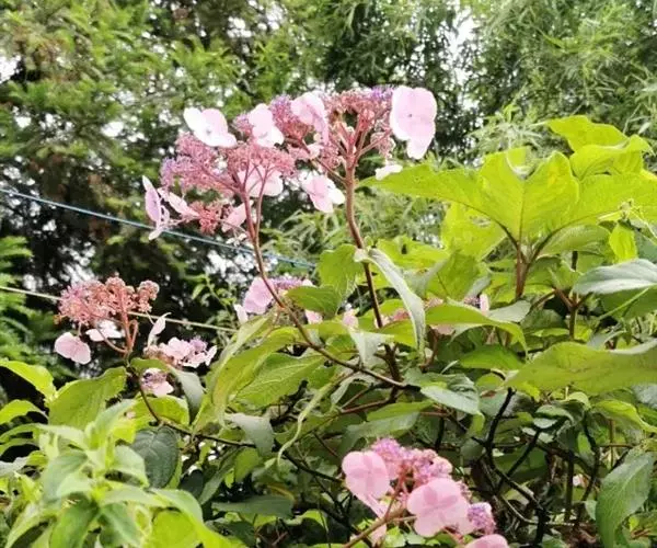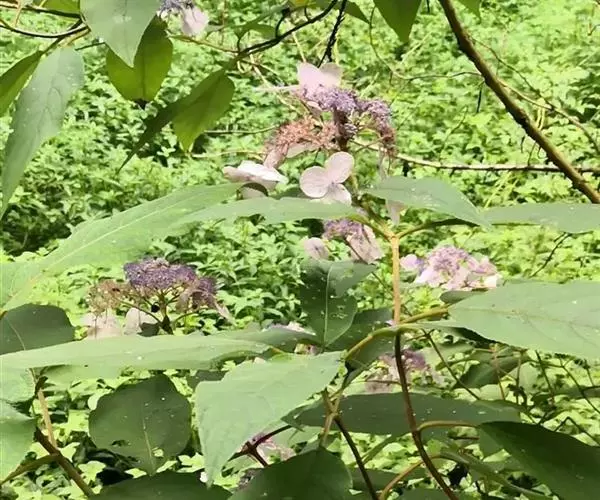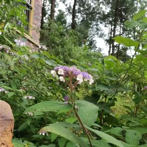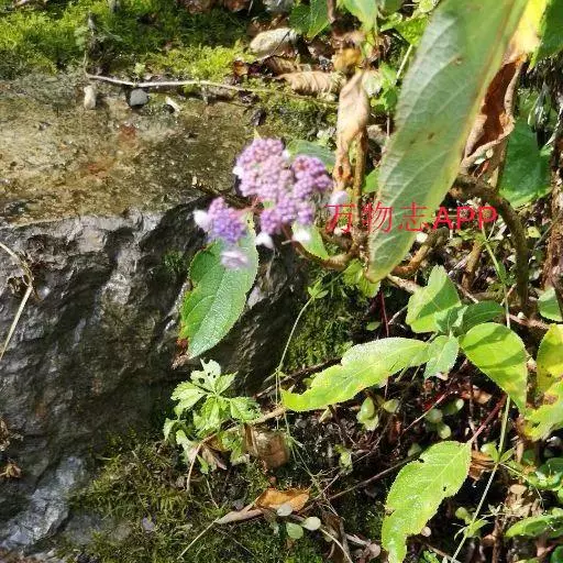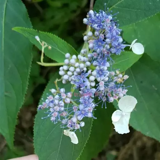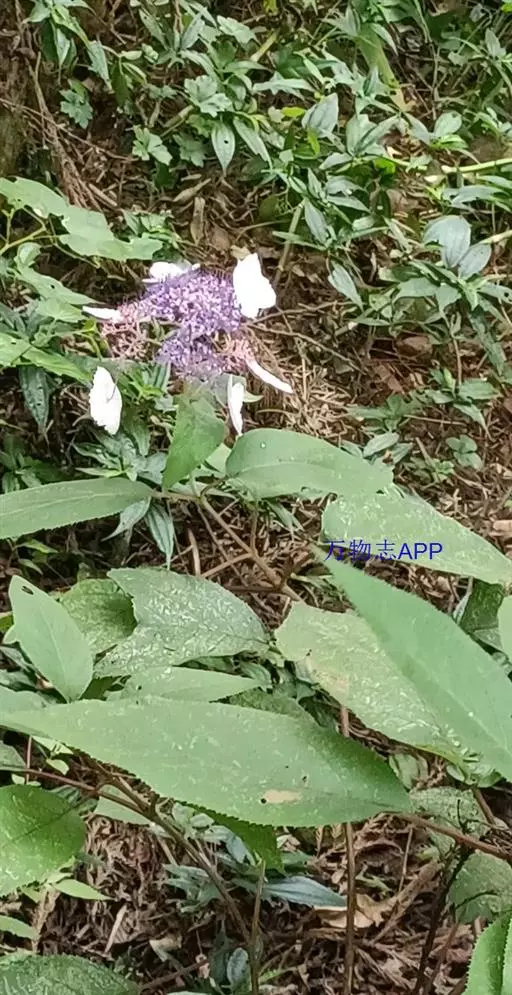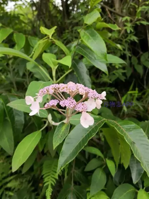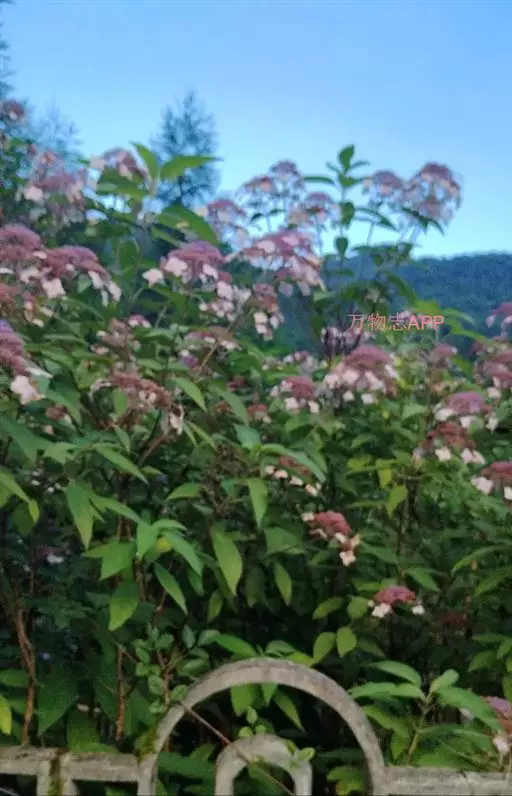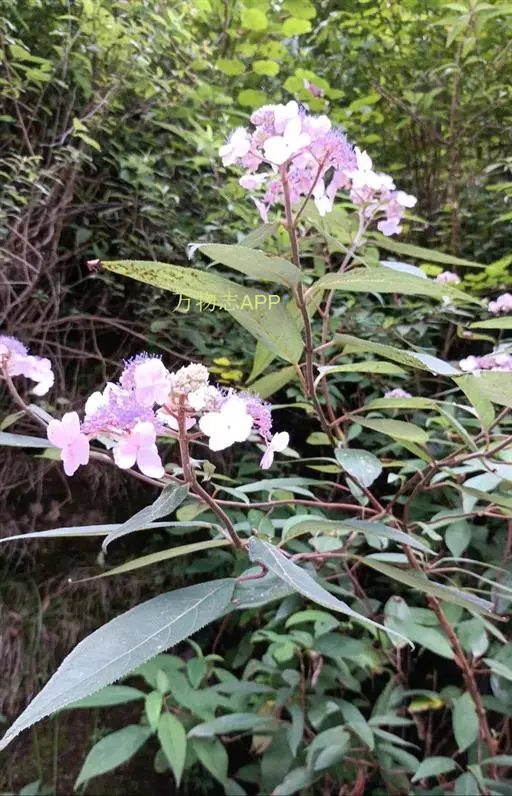 伞房状聚伞花序大,直径达28厘米,顶端稍拱,分枝扩展,密被灰白色糙伏毛;不育花萼片4-5,阔卵形、阔椭圆形或近圆形,结果时长1.3-2.7厘米,宽1.1-2.5厘米,先端钝头渐尖或近截平,基部具爪,边全缘或具数齿,白色或淡紫红色;孕性花淡紫红色,萼筒钟状,长约2毫米,萼齿三角形,长约0.5毫米;花瓣长卵形,长2-2.5毫米,初时顶端稍连合,后分离,早落;雄蕊不等长,较长的长约6毫米,较短的长约3毫米,花药长圆形,长约0.5毫米;子房下位,花柱2,结果时长约2毫米,近棒状,直立或外弯。