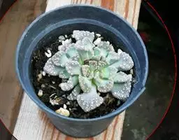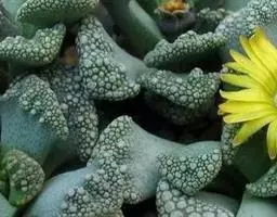 荒玉为番杏科生石花属,原产南非。株体呈白粉色,表面布满凹凸纹路,凹陷处为红褐色,每年秋季开黄花。