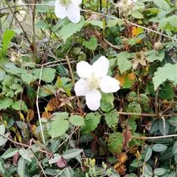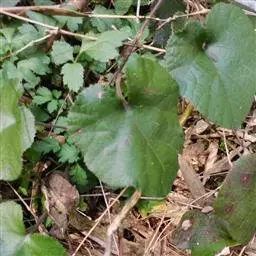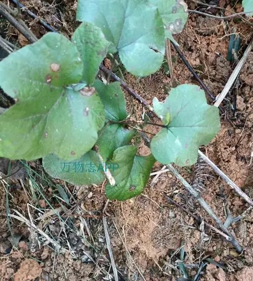 蔓性常绿小灌木。茎常伏地生根,长出新株,密生褐色或灰白色柔毛,无刺或有少数刺;葡匐枝长达2m。单叶;叶柄长3-9cm;托叶条裂;叶片近圆形,直径5-11cm,先端急尖或圆钝,基部心形,边缘常5浅裂,上面近无毛,下面和叶柄有绒毛,沿叶脉较密。总状花序短,腋生,有花4-10朵,密集;总花梗和花梗密生灰白色短绒毛和散生的刺刚毛;花白色,直径约1cm;萼裂片披针形,外面淡黄色长毛。聚合果近球形,直径6-10mm,紫黑色。花期7-8月,果期9-10月。
