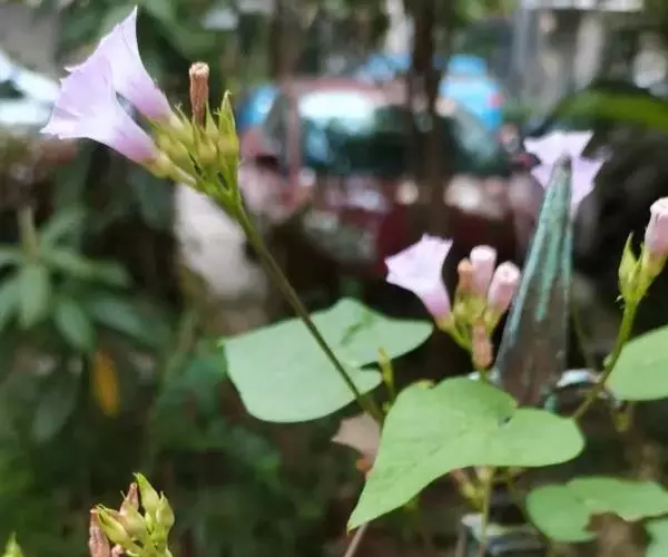 草本;茎缠绕或有时平卧,无毛或散生毛,且主要在节上。叶宽卵形至圆形,长2.5-7厘米,宽2-6厘米,全缘或有粗齿或深3裂,基部心形,两面无毛或散生疏柔毛;叶柄长2.5-6厘米,无毛或有时有小疣。花序腋生,花序梗短于或长于叶柄,长2.5-5.5厘米,较叶柄粗壮,无毛,明显有棱角,顶端具小疣,1朵花或少花至数朵花成伞形状聚伞花序;花梗多少具棱,有小瘤突,无毛,长5-7毫米;苞片小,披针状长圆形;萼片近相等或稍不等,长5-8毫米,外萼片稍短或近等长,长圆形,钝或锐尖,具小短尖头,背部散生疏柔毛,边缘明显有缘毛,内萼片有时稍宽,椭圆状长圆形,锐尖,具小短尖头,无毛或散生毛;花冠漏斗状,长约1.5厘米,无毛,淡红色或淡紫红色,冠檐裂片短而钝,有小短尖头;雄蕊内藏,花丝基部有毛;子房有毛。蒴果近球形,高5-6毫米,具花柱基形成的细尖,被细刚毛,2室,4瓣裂。种子4或较少,长3.5毫米,无毛。