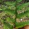 孢子及孢子萌发:阔鳞鳞毛蕨孢子囊群小,生于小脉下部,圆形黄棕色。温暖干燥的环境下,孢子囊成熟后自行开裂释放出孢子。孢子黄褐色,圆形,周壁具皱褶,单裂缝;播种10天后从孢子壁的单裂缝处伸出一条无色透明的初生假根,标志着孢子萌发。孢子萌发类型为书带蕨型。
