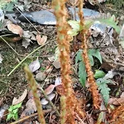 原叶体:片状体顶端为排列整齐的分生组织,由于分生组织的活动,细胞数目有规律地增多,播种4周左右,发育成幼原叶体。原叶体发育方式为三叉蕨型。成熟的原叶体深绿色,叶绿体丰富,形状为心脏形,边缘略有波状。原叶体边缘及腹面均有毛状体分布,数量丰富,叶绿体分布在毛状体顶端。在成熟的原叶体的腹面叶脉处,假根繁多,呈褐色且不含叶绿体。在同一原叶体上产生精子器和颈卵器,自播种后6-8周发生精子器,比颈卵器较早发生,精子器混生于基部假根丛中,可达数个至数十个,精子器由3层胞组成,最上面为盖细胞,成熟时盖细胞掀开,释放出精子,颈卵器约在精器发生4-5周后发生,其腹部包埋在配子体中,颈部由4列6层细胞组成,包含1个双核颈沟细胞,1个腹沟细胞和1个卵细胞,颈卵器成熟后顶端的细胞分开,有时反卷。