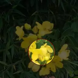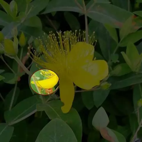 花瓣金黄色,无红晕,多少内弯,长圆状倒卵形至宽倒卵形,长1.2-1.8厘米,宽1-1.4厘米,长约为萼片1.5-2.5倍,边缘全缘或略为啮蚀状小齿,有1行近边缘生的腺点,有侧生的小尖突,小尖突先端多少圆形至消失。雄蕊5束,每束有雄蕊约50-70枚,最长者长7-12毫米,长约为花瓣的2/5-1/2,花药亮黄色。
