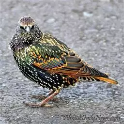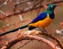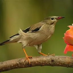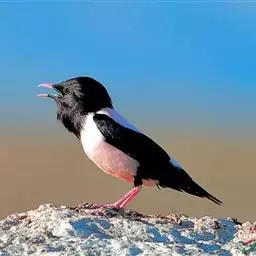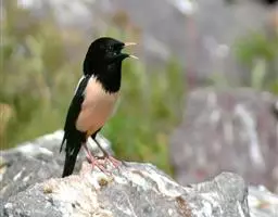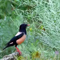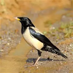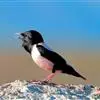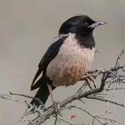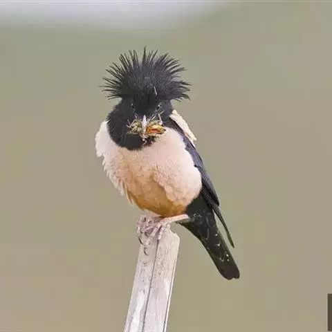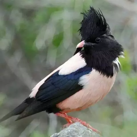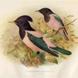 粉红椋鸟是雀形目椋鸟科粉红椋鸟属鸟类。头顶具紫色羽冠;头部、颈、颏、喉黑色具蓝紫色金属光泽;背和腹粉红色;两翅和尾黑褐色;虹膜暗褐色;嘴黄色或粉红色,上嘴基部黑色,冬季嘴为褐色;脚黄色。嘴较其他椋鸟短而钝,上嘴弯曲较明显;脚较粗壮,爪发达。粉红椋鸟分布于欧洲东南部、西伯利亚、西亚、印度和斯里兰卡岛等地区,在中国新疆西部和北部、西藏西部、澳门、台湾等地也能看到其身影。栖息于干旱平原、荒漠或半荒漠地区。常成群活动,鸣声嘈杂。主要在地面觅食,以甲虫、蝗虫、毛虫等各种昆虫为食,偶食植物果实和种子。繁殖期5—7月,营巢于岩壁缝隙、树洞中,每窝产卵4—6枚,卵白色或淡蓝色,孵化期13—15天。雏鸟晚成性,由雌雄亲鸟共同喂养。粉红椋鸟种群数量较少,已被列入中国国家林业局2000年8月1日发布的《国家保护的有益的或者有重要经济、科学研究价值的陆生野生动物名录》。