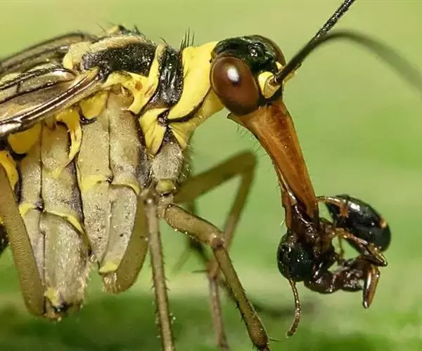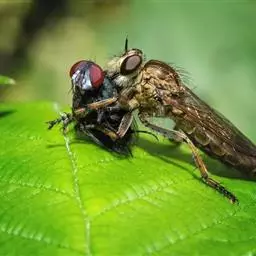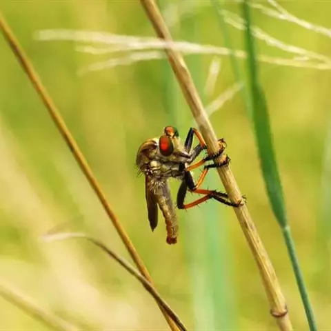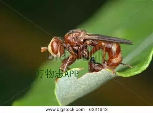 食虫虻的这些特性,使它们成为昆虫世界中的魔鬼。人们在一些恐怖片、电子游戏中也常用它作为模型来塑造角色。图中所示的是一只雄性中华单羽食虫虻捕食斑须蝽。有些雄性食虫虻甚至会把猎物作为“彩礼”送给雌性,期望得到雌性的青睐。食虫虻的幼虫通常是取食植物的。