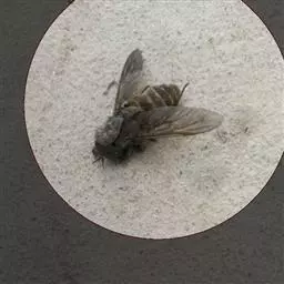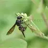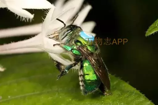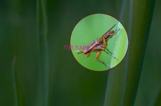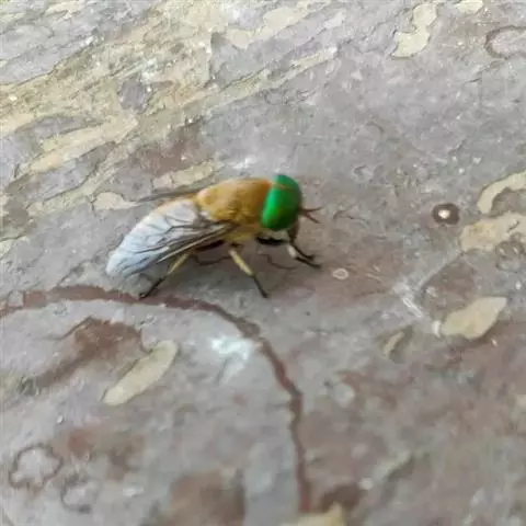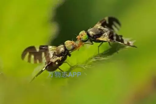昆虫,形状像蝇而略大,体黑绿色,雄的吸植物的汁液,雌的吸人畜的血液。