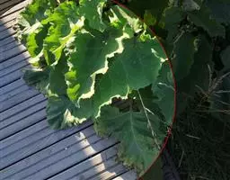 基生叶及上部叶均为二至三回三出式羽状分裂;叶片轮廓为三角形,长20-45厘米,叶柄长5-20厘米,基部膨大成扁而抱茎的叶鞘;末回裂片菱状卵形至卵状披针形,长5-10厘米,宽3-6厘米,急尖至渐尖,边缘有内曲的圆钝齿或缺刻状齿5-8对,通常齿端有锐尖头,基部截形,有时中部深裂,表面深绿色,背面灰白色,两面均无毛,最上部的叶常简化成无叶的叶鞘。