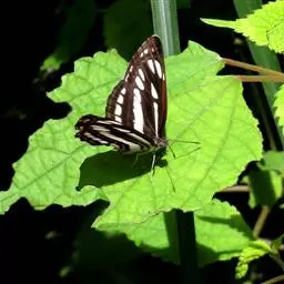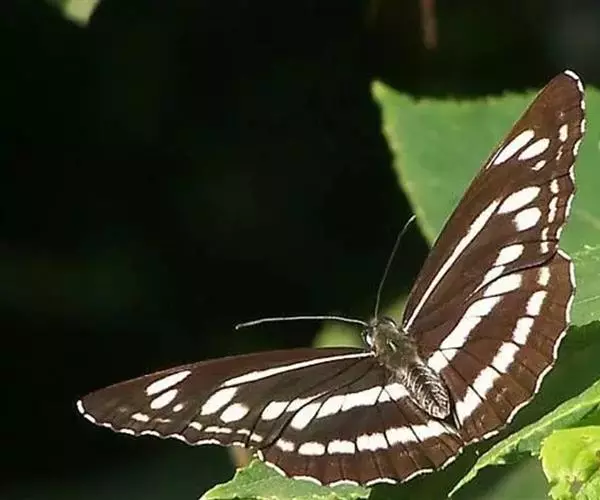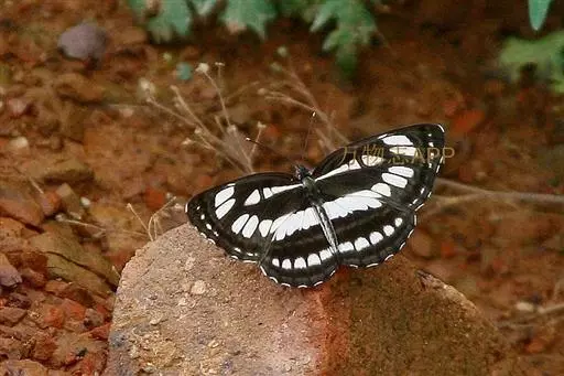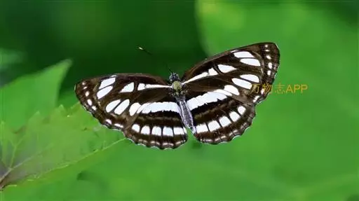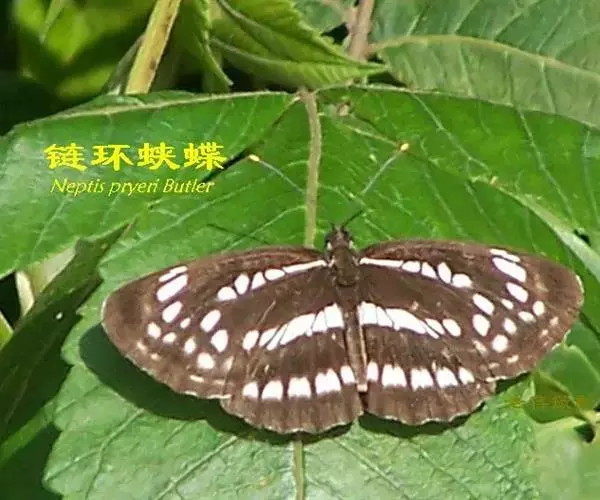 中环蛱蝶 翅展40.0~50.0 mm。体背面黑色,腹面苍黄色。触角顶端黄色。翅表面黑褐色,斑纹白色,外缘波状并有白色缘毛;翅展开时显示3列由大小斑纹组成并两翅相连的白色带。前翅中室内有一条长形纵带,其前方有一个箭头状斑纹。翅下表面黄色或黄褐色,斑纹清晰,周缘有明显的黑线围绕。