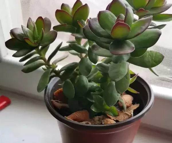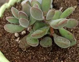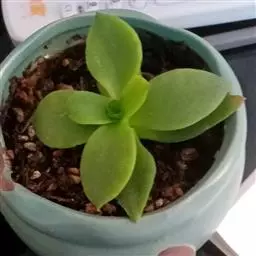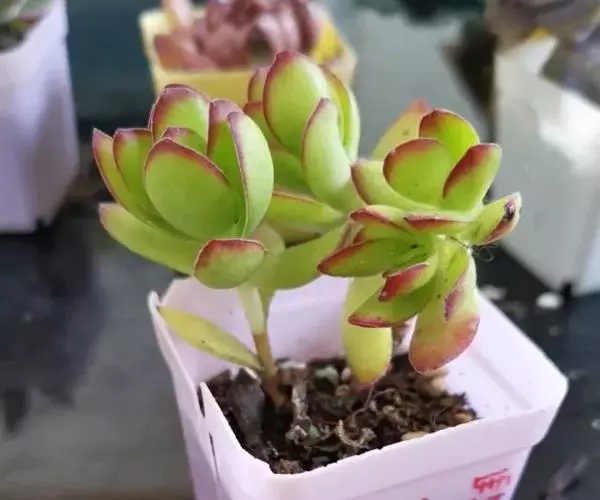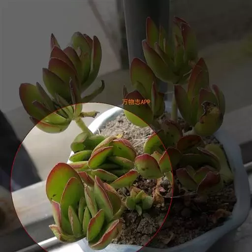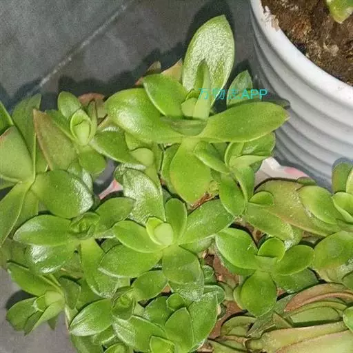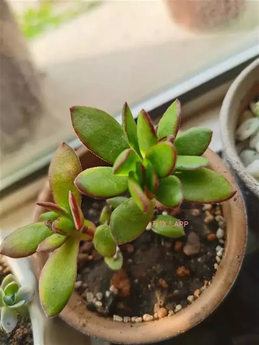 多年生肉质草本植物,植株丛生,有细小的分枝,茎肉质,时间养久了茎会 逐渐半木质化,天狗之舞叶片有点薄,叶片颜色绿,叶缘褐红色,在晚秋和早春,温差大的时候红褐色尤为明显。天狗之舞叶片交互对生无叶柄,基部连在一起,新叶上下叠生,成叶上下有些许间隔。开花为白色,4~5月开放。