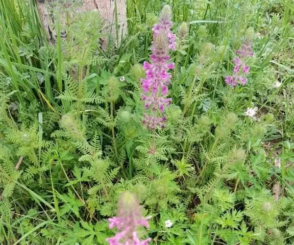 返顾马先蒿:多年生草本,高30-70cm。根多数丛生,细长而纤维状。茎常单生,直立,上部分枝,粗壮,中空,方形有棱。叶互生或对生;叶柄短,上部叶近无柄,无毛;叶片膜质至纸质;卵形至长圆状披针形,长2.5-5.5cm,宽1-2cm,先端渐窄,基部楔形或圆形,边缘有钝圆的重锯齿,两面无毛或有疏毛。花单生于茎枝顶端的叶腋中;无梗或有短梗;萼长圆卵形,膜质,前方深裂,齿仅2枚,宽三角形,全缘或略有齿,光滑或有微缘毛;花冠淡紫红色,长2-2.5cm,管长1.2-1.5cm,向右扭旋,上唇盔状,扭向右方,下唇大,有缘毛,3裂,中裂较小;雄蕊花丝前面一对有毛;花柱伸出喙端。蒴果斜长圆状披针形,长1-1.6cm。花期6-8月,果期7-9月。