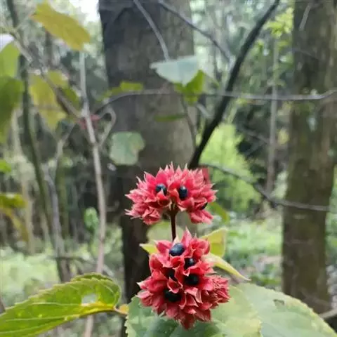 核果近球形,径5-6毫米,成熟时蓝黑色,大半被紫红色增大的宿萼所包。