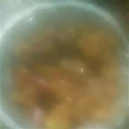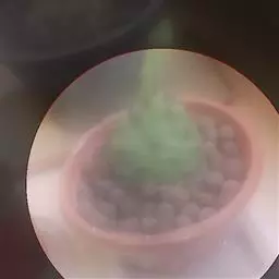 (2) 把三色泥子分别挤成丸子,入炒勺内凉水中,然后上火逐渐加热,水开(勿大开)后,用手勺背面轻轻按压,使鱼丸慢慢熟透,捞出泡于汤中。