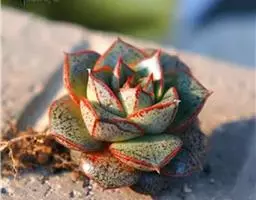 株高约在15厘米以内,冠幅15-22厘米;叶密集排列呈莲座状,叶片肥厚肉质,匙形至宽匙形,略被白霜,有明显的龙脊线,具明显的短叶尖,叶片淡蓝绿,在光照充足、温差较大的适宜环境中,叶缘呈粉色至暗紫红色;花茎淡紫红色抽出于叶腋,总状花序,小花倒钟形,花瓣5,橙红色,先端金黄色,绽放在冬春季节。
