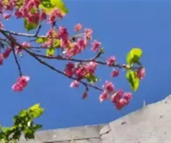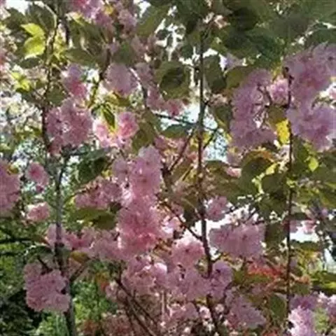 高大乔木可达30米,叶片长圆卵形至长圆倒卵形,长约10厘米,宽5厘米,先端渐尖,叶边有单锯齿或重锯齿,下面中肋和细脉有长柔毛,花先叶开,伞形总状花序,有短总花梗,花2-4朵,直径约2.9厘米,花梗长1-2.3厘米,萼筒宽钟状,深红色,萼片三角形,先端圆钝,直立,深红色;花瓣倒卵形,先端全缘或微凹,深粉红色。花期2-3月。