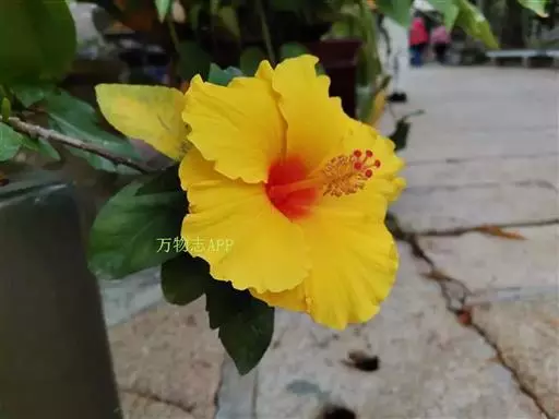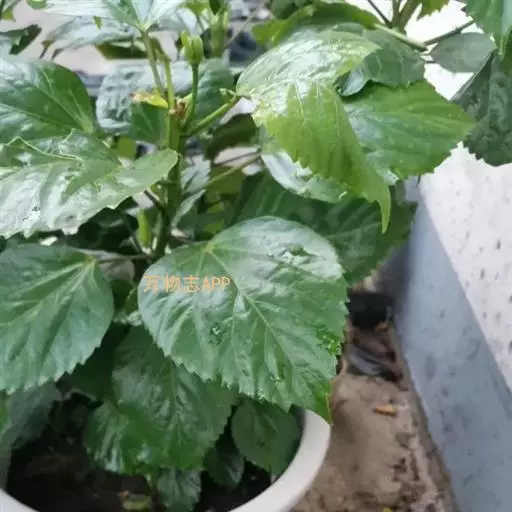 朱槿是常绿灌木,株高约1-3米;小枝圆柱形,疏被星状柔毛。叶阔卵形或狭卵形,长4-9厘米,宽2 5厘米,先端渐尖,基部圆形或楔形,边缘具粗齿或缺刻,两面除背面沿脉上有少许疏毛外均无毛;叶柄长5-20毫米,上面被长柔毛;托叶线形,长5-12毫米,被毛。