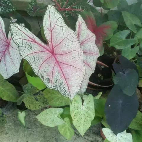 叶狭长,披针形,绿色,具白、粉、红色斑纹。花小,鲜红色。