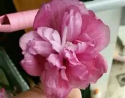 重瓣,花小,深红色。