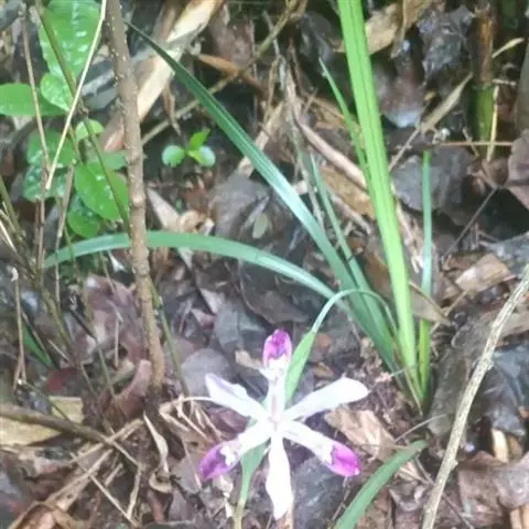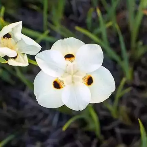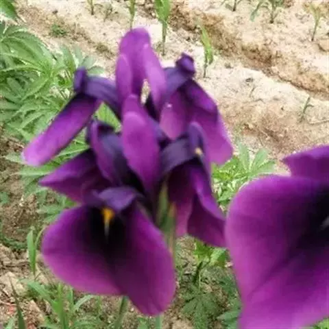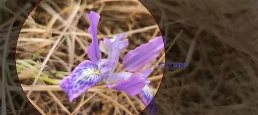 粗根鸢尾(学名:Iris tigridia Bunge ex Ledeb.):多年生草本,植株棕褐色。根状茎不明显,短而小,木质;须根肉质,有皱缩的横纹,黄白色或黄褐色,不分枝或少分枝;叶深绿色,有光泽,狭条形,无明显的中脉。花茎细,长2-4厘米,不伸出或略伸出地面;苞片2 枚,黄绿色,膜质,狭披针形,顶端短渐尖,内包含有1朵花;花蓝紫色,直径3.5-3.8厘米;外花被裂片狭倒卵形,有紫褐色及白色的斑纹,爪部楔形,内花被裂片倒披针形,顶端微凹,花盛开时略向外倾斜。蒴果卵圆形或椭圆形,果皮革质;种子棕褐色,梨形,有黄白色的附属物。花期5月,果期6-8月。