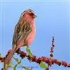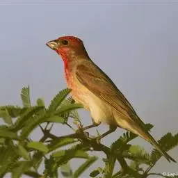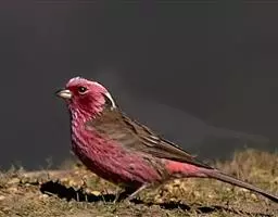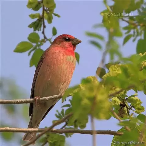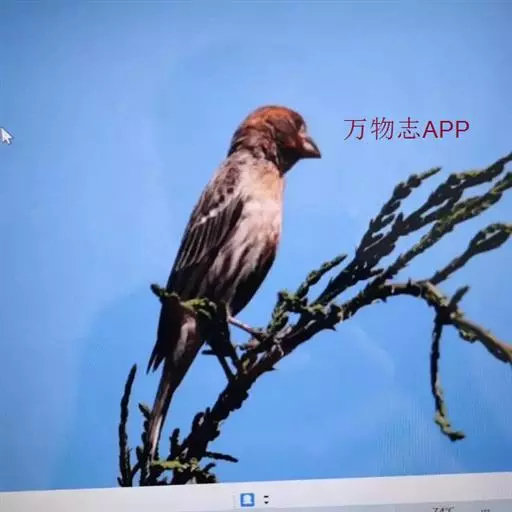 红腰朱雀:体长12-14厘米,小型鸟类。雄鸟前额和眉纹玫瑰粉红色,头顶和一宽的贯眼带深红褐色,背红…