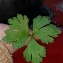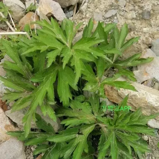 基生叶3-5,有长柄;叶片肾状五角形,长(1.6-)2.5-7.5厘米,宽(2-)4.5-14厘米,三全裂,中全裂片宽菱形或菱状卵形,有时宽卵形,宽(0.7)2.2-7厘米,三深裂,深裂片上部有少数小裂片和牙齿,侧全裂片不等二深裂,两面都有糙伏毛;叶柄长(3-)5-22厘米,有白色柔毛,基部有短鞘。