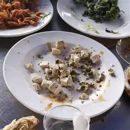 5.盘中装入饭,配上杏仁碎,再加上做好的滑子菇菜花4,即可。