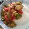 2、锅里放少许油后,放大黄豆和青椒炒至半熟,加入西红柿稍微翻炒,放入少许盐,加入咖喱粉,注入少许水。