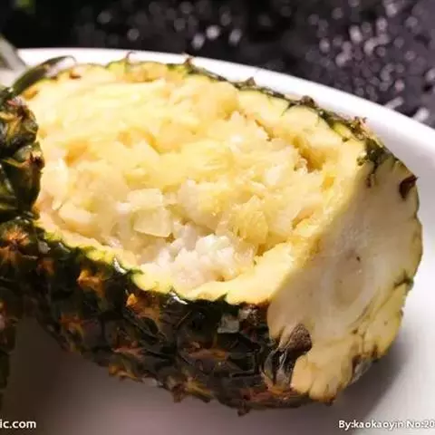 5) 出锅,装入挖空的菠萝盅内,浇上一勺菠萝汁。