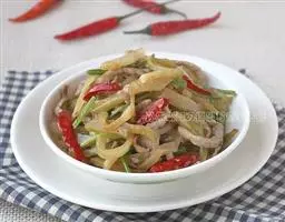 4.油热后,把切好的肉和菜下锅去炒几分钟