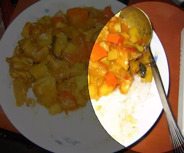 胡萝卜,洋葱和土豆搭配,颜色很棒,营养一等,味道甜丝丝的。苹果和西红柿带来丰富的维生素,味道一点点酸,和刚才的甜味在一起,两种都不很明显,但是却稍稍中和了咖喱辛辣的味道,口感很爽。关键是营养很均衡!