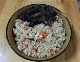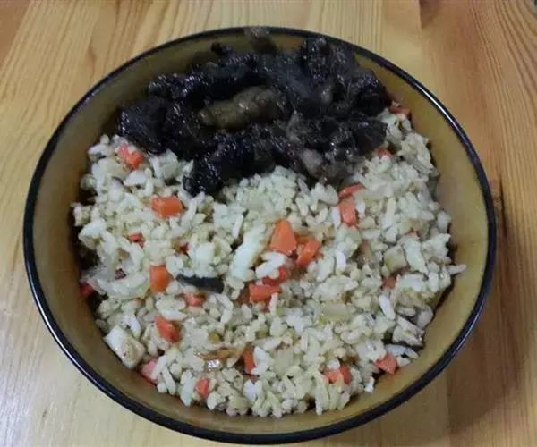 4、把所有炒好的菜,肉,汤和葡萄干,全部倒入电饭锅,把泡好的米饭均匀撒在上面一层,1:2比例为好,开始焖20分钟。