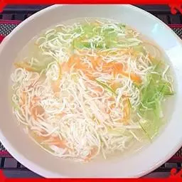 5、拿出汤袋,倒入剩下的洋葱胡萝卜,加入冰糖,煮约5分钟。此时尝一下味道,如果不够咸可以再加点盐;