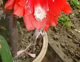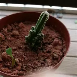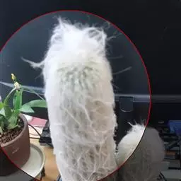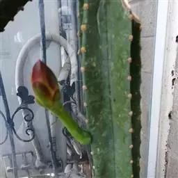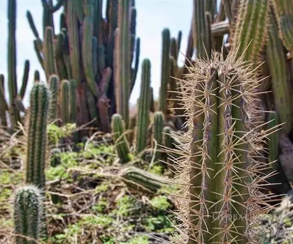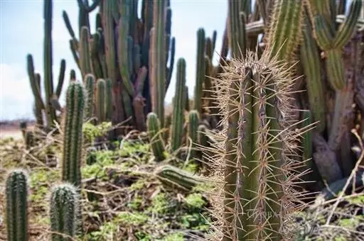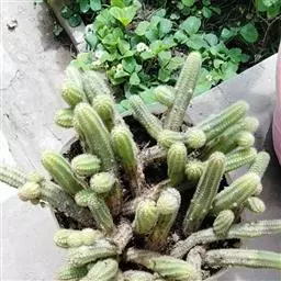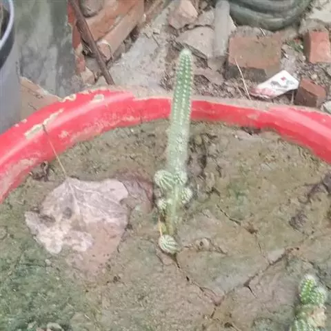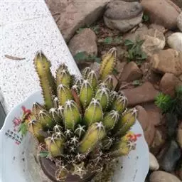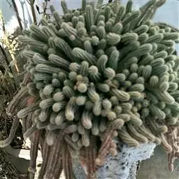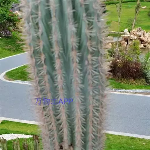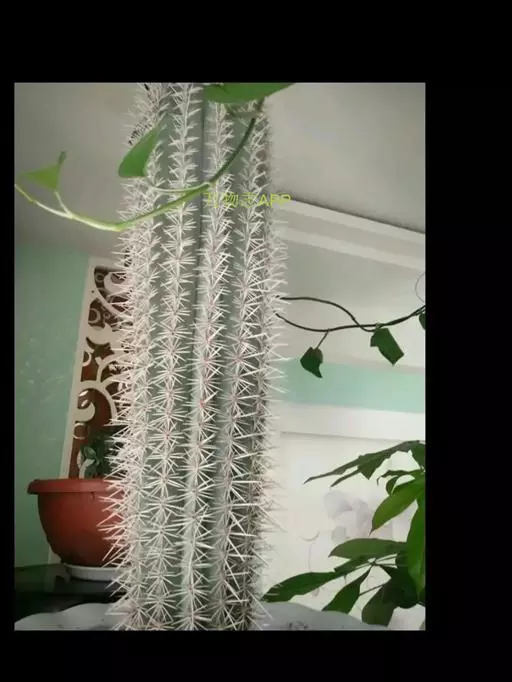 仙人掌科摩天柱属,高大树状,高达12m或更高,茎干直径1m,具棱10~16,茎被白霜。初期有刺10~20,以后增至50或更多, 针状至锥形,白至黑色,上部刺座无刺。花白色。