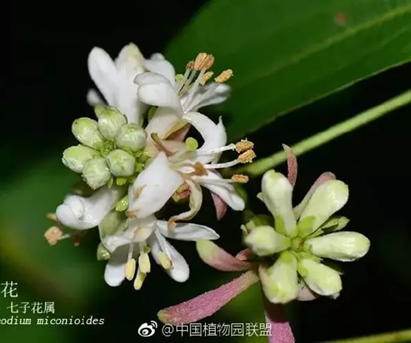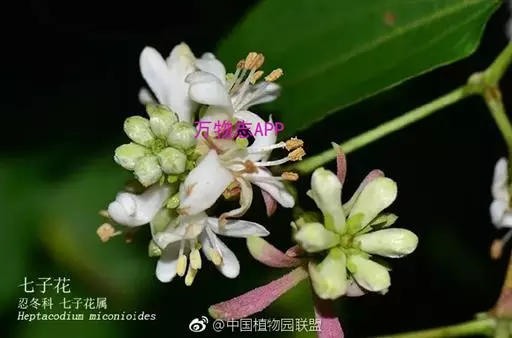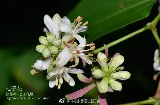 七子花(拉丁学名:Heptacodium miconioides Rehd.)是忍冬科,七子花属落叶小乔木,中国特有,一般树高达7米;树皮灰褐色,片状剥落;幼枝略呈四棱形,红褐色。叶对生,厚纸质,卵形至卵状长圆形,圆锥花序顶生,由多数密集呈头状的穗状花序组成;穗状花序,花冠白色,稍芳香,该种于3月中下旬展叶,5月上中旬出现花蕾,到7月初开花,花期较长,可延至9月上旬,果实于10月成熟。