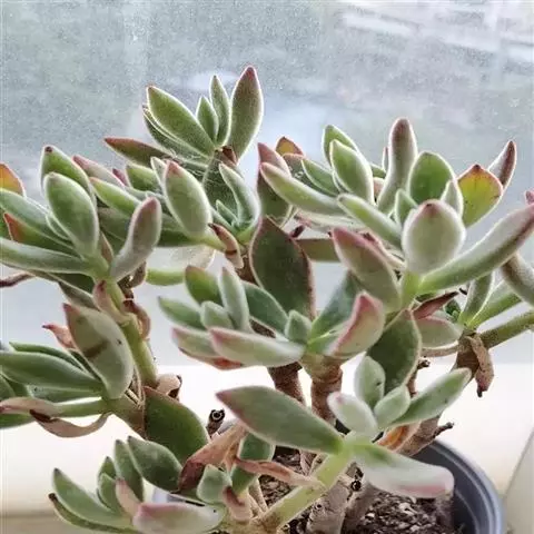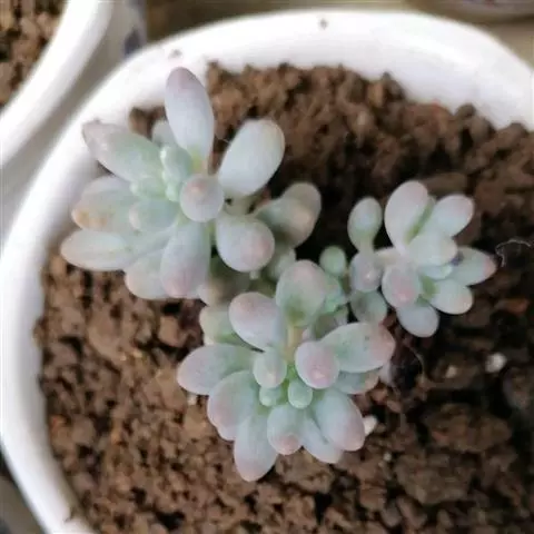 蓝苹果多肉夏季叶端的红色容易变淡,甚至完全退掉,基本呈蓝绿色状态。花期春季,聚伞花序,花开5瓣,五角星形,柠檬黄色。