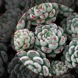 蓝苹果多肉植株常呈莲座状株型,易从茎的下部长出新枝,形成群生态,渐变成老桩。叶片,匙形,轮生,莲座状排列,肉质饱满,略显扁平,叶背有些凸起,有龙骨线,叶面平,或微微内凹,叶端稍收窄、收尖,叶色较为丰富,随季节、温差的变化而变化,有蓝绿色、紫色、漂亮的果冻色等,叶端有桃红色、粉红色、或是玫瑰红色的色晕,老叶的叶面、叶背有大面积的红晕,出状态时红得更加浓烈、更加令人陶醉,叶面被有白粉。