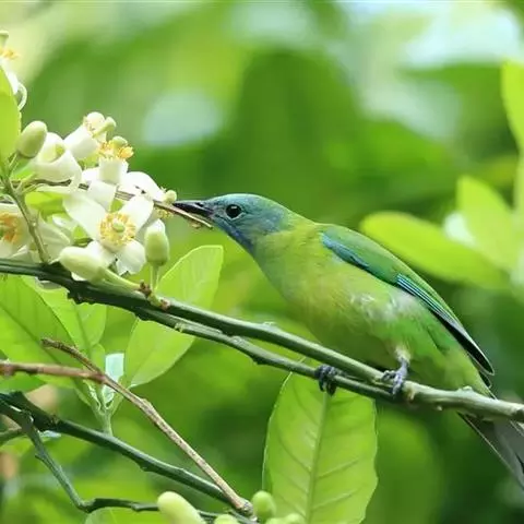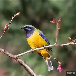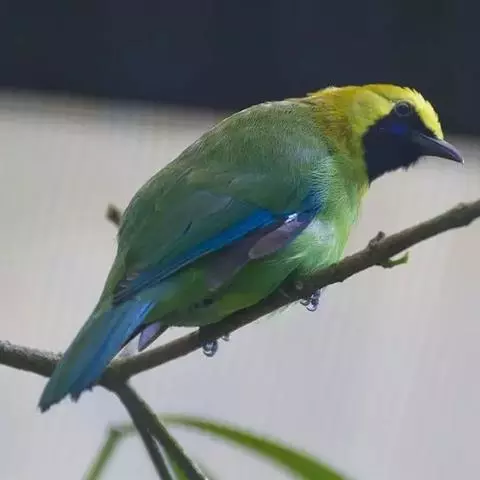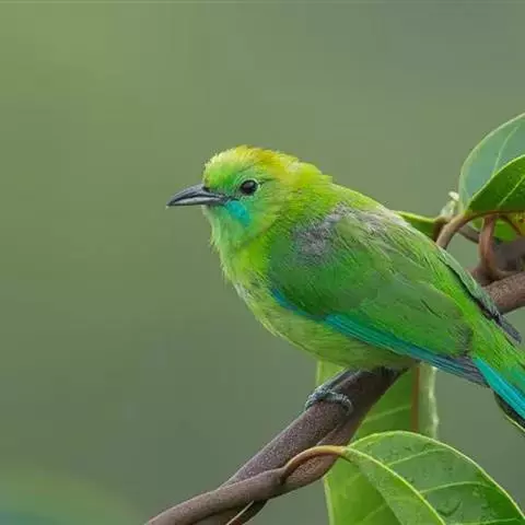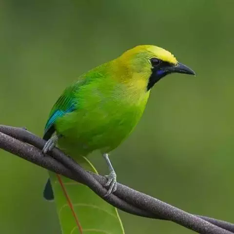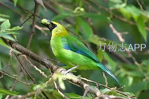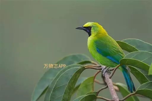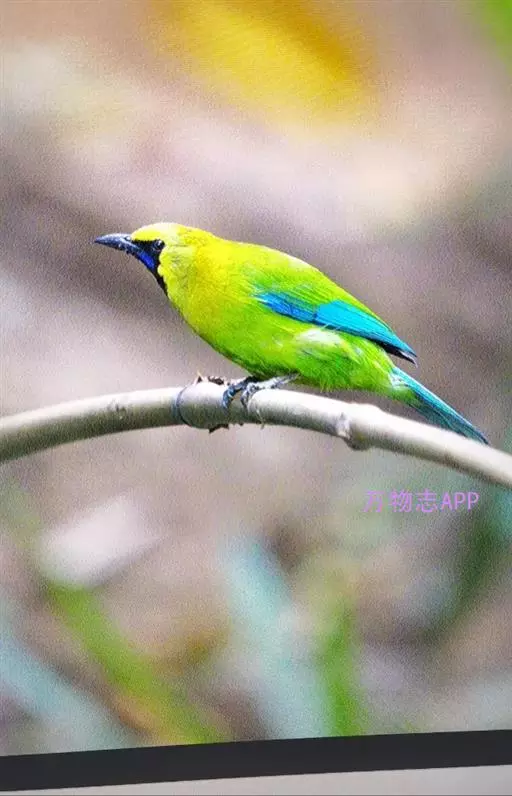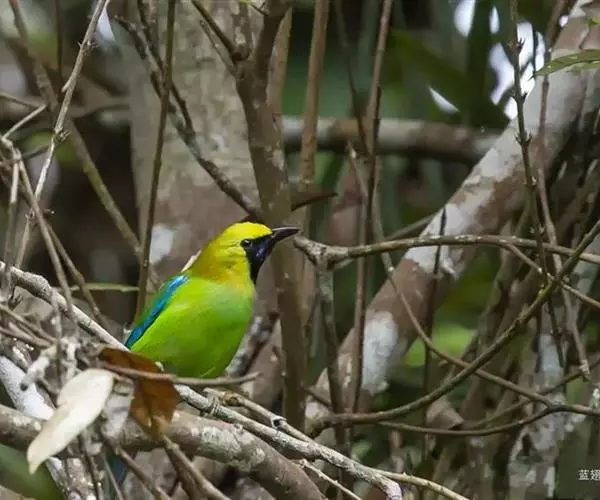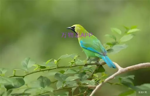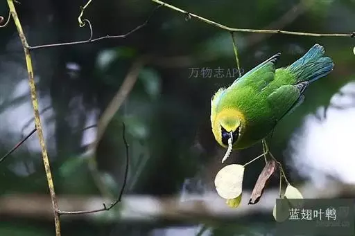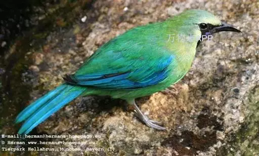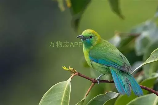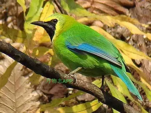 蓝翅叶鹎:小型鸟类,体长15-18厘米。雄鸟通体草绿色,尾蓝绿色,肩和翅亮蓝 色,胸缀有黄色,…