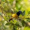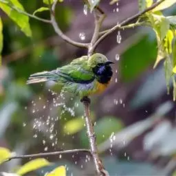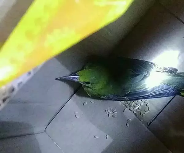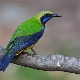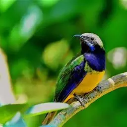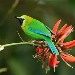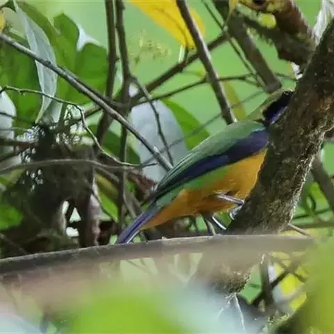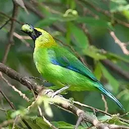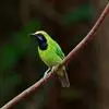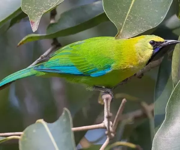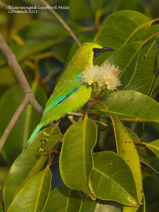 蓝翅叶鹎(学名:Chloropsis moluccensis):小型鸟类,体长15-18厘米。雄鸟通体草绿色,尾蓝绿色,肩和翅亮蓝 色,胸缀有黄色,颏、喉黑色。雌鸟颏,喉蓝绿色。
