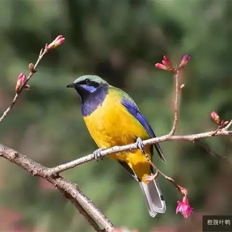橙腹叶鹎体形大小和金额叶鹎相似,体长16~20厘米。额至后颈黄绿色,其余上体绿色,小覆羽亮钴蓝色,…