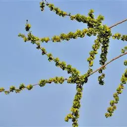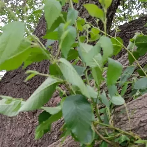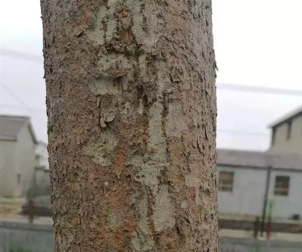 树皮暗灰色,粗糙,不规则纵裂。幼树枝条直立,且被白色毛;老树枝条先端下垂,有时木栓质发达成为瘤状。…