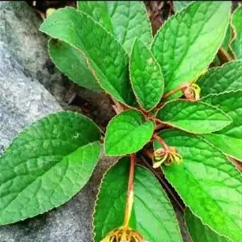 叶对生,密集于茎近顶端,具叶柄;叶片长圆形或狭椭圆形,长3-12厘米,宽2-5.5厘米,顶端钝,基部圆形,边缘密生小钝齿,上面密被短糙伏毛,下面和叶柄密被锈色或灰色毡毛,侧脉每边5-6对,上面不明显,下面隆起;叶柄长1.5-7厘米。