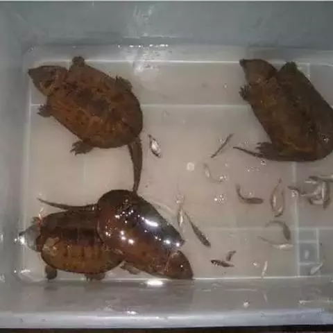 稚龟孵出三天后活动量明显增加,开始觅食,按每百只稚龟投喂一个熟蛋黄的标准,开始定时投喂,在一月龄之内以黄粉虫、蝇蛆等动物性饵料为主。随着稚龟的不断长大饵料量应逐渐加大,保证够吃略有多余。五个月后应分级饲养,按龟个体大小不同进行分级,每1~2月一次,在分级过程中进行分群、组合,以同级个体适当的密度,进行分池饲养,饵料要品种多样、优质,投饵量不可过少过多,每天定点投喂2次(间隔8小时以上),每次投喂量均衡,可适当先投喂些动物内脏和下脚料,之后再投喂鲜活食料,投饵量控制在体重的10%左右。投饵应遵循“定点、定时、定量、定质”的原则,同时也因个体大小、食欲、气候、气温、数量等实际情况酌情增减。