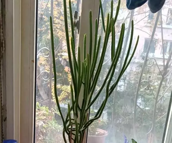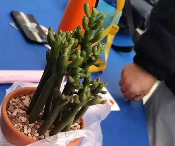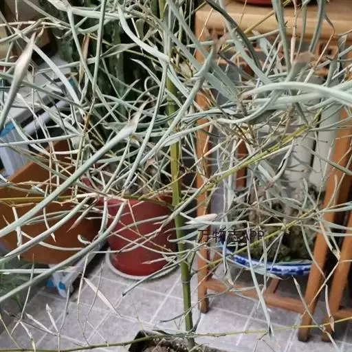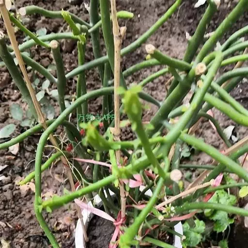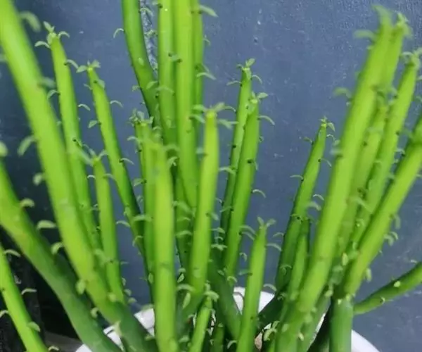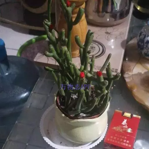 绿玉树是一种热带灌木或小乔木,可高达2~9米。叶细小互生,呈线形或退化为不明显的鳞片状,长约1厘米,宽约0.2厘米,早落以减少水分蒸发,故常呈无叶状态。
