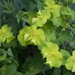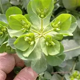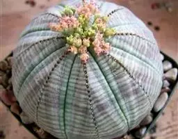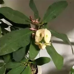 花为杯状聚伞花序生于枝顶或节上有短总花梗,总包陀螺状,直径约0.2厘米,具有5枚腺体,内披柔毛,花冠5瓣,黄白色,花无花被,雄花小数,雌花具多数总苞,苞片细小。