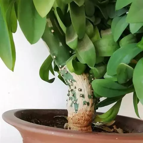 浇水过多时,易引发根腐病,叶片也会发黄,甚至出现灰色霉斑而腐烂,应注意通风排水,必要时可喷洒多菌灵可湿性粉剂防治。此外,还可有粉蚧为害叶片,形成白色的蜡粉,应及时消除病虫叶,防止蔓延。