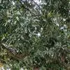芒果 常绿大乔木,高10-20米;树皮灰褐色,小枝褐色,无毛。叶薄革质,常集生枝顶,叶形和大小变化较大,通常为长圆形或长圆状披针形,长12-30厘米,宽3.5-6.5厘米,先端渐尖、长渐尖或急尖,基部楔形或近圆形,边缘皱波状,无毛,叶面略具光泽,侧脉20-25对,斜升,两面突起,网脉不显,叶柄长2-6厘米,上面具槽,基部膨大。