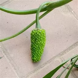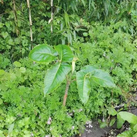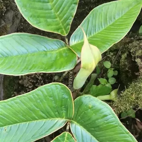 花序柄短于叶柄,有时长为叶柄的1/2。佛焰苞管部绿色,宽倒圆锥形,长3.6-4厘米,上部粗1.8-2厘米,喉部多少具宽耳,耳内面深紫,外卷;檐部下弯成盔状,前檐具卵形唇片,下垂,先端外弯。肉穗花序单性,雄花序无柄,圆柱形,长1.5厘米,粗8毫米,雄花规则地螺旋状排列,每花花药2,具短柄,2室,药室短卵圆形,顶孔横裂;雌花序近球形,长宽1.5厘米,子房卵圆形,顶部渐狭,胚珠1。