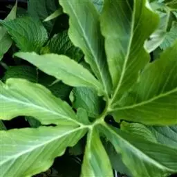 块茎扁球形,具小球茎。鳞片向上渐狭,内面的长约12厘米。叶2(-1),叶柄长15-30厘米,粗7-8毫米,下部1/3具鞘,鞘管状,口部截形;叶片3全裂,裂片无柄或具短柄,中裂片宽椭圆形,长16-23厘米;侧裂片偏斜,长圆形或椭圆形,长15-18厘米,宽均在10厘米以上,先端渐尖,具长1-1.5厘米的锥状突尖,侧脉脉距约1厘米,集合脉距边缘5毫米。